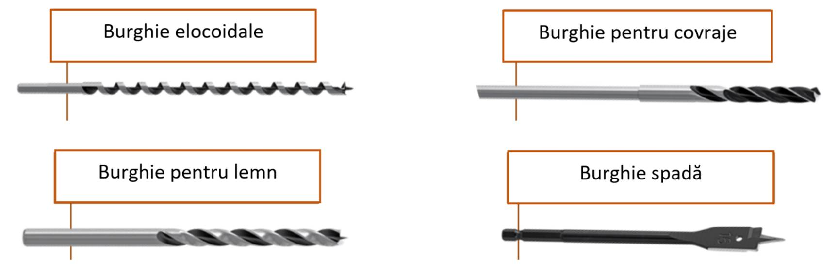- Burghie pentru lemn – folosite pentru a obține margini netede și pereți interiori care permit găurirea precisă
