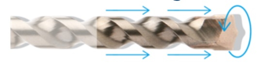 3. Găurire cu rotopercuție SDS Max – burghiul se rotește cu un număr mic de impacturi cu energie ridicată. Această metodă este recomandată pentru găurirea structurilor dure, cum ar fi betonul armat (de exemplu RT-MAXT Turbodrill)