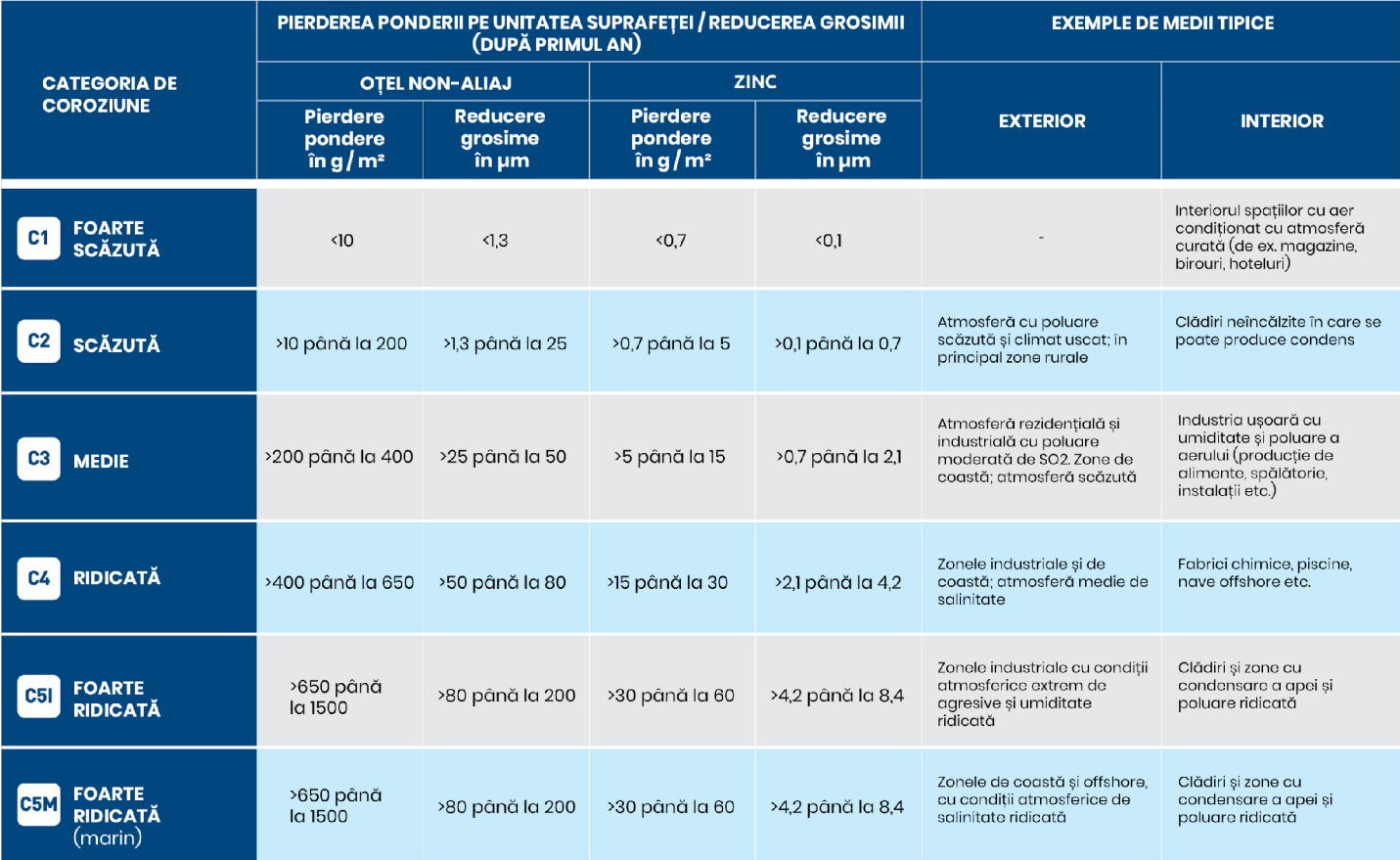 Noi diferențiem 5 tipuri de medii corozive în funcție de expunea la condițiile meteorologice.